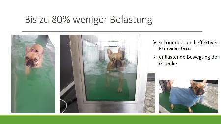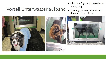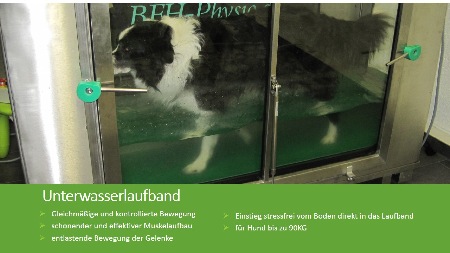 Einsatzgebiete: - Therapeutischer Einsatz - Vor- und Nachsorge bei Operationen (Bandscheibenvorfall, Kreuzband) - Arthrose - Degenerative Skeletterkrankungen HD, ED, OCD - Neurologische Störungen (Ataxie, Lähmungen) - Gewichtsreduktion - Ausgleich Bewegungsmangel - Kraft- und Ausdauertraining für Sport- und Arbeitshunde