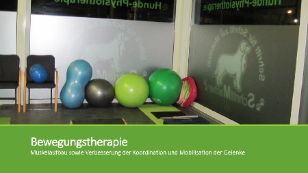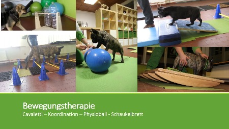 Zum Einsatz kommen Trampolin, Stepper, Cavaletti-Stangen, Erdnussbälle, Theraband etc.